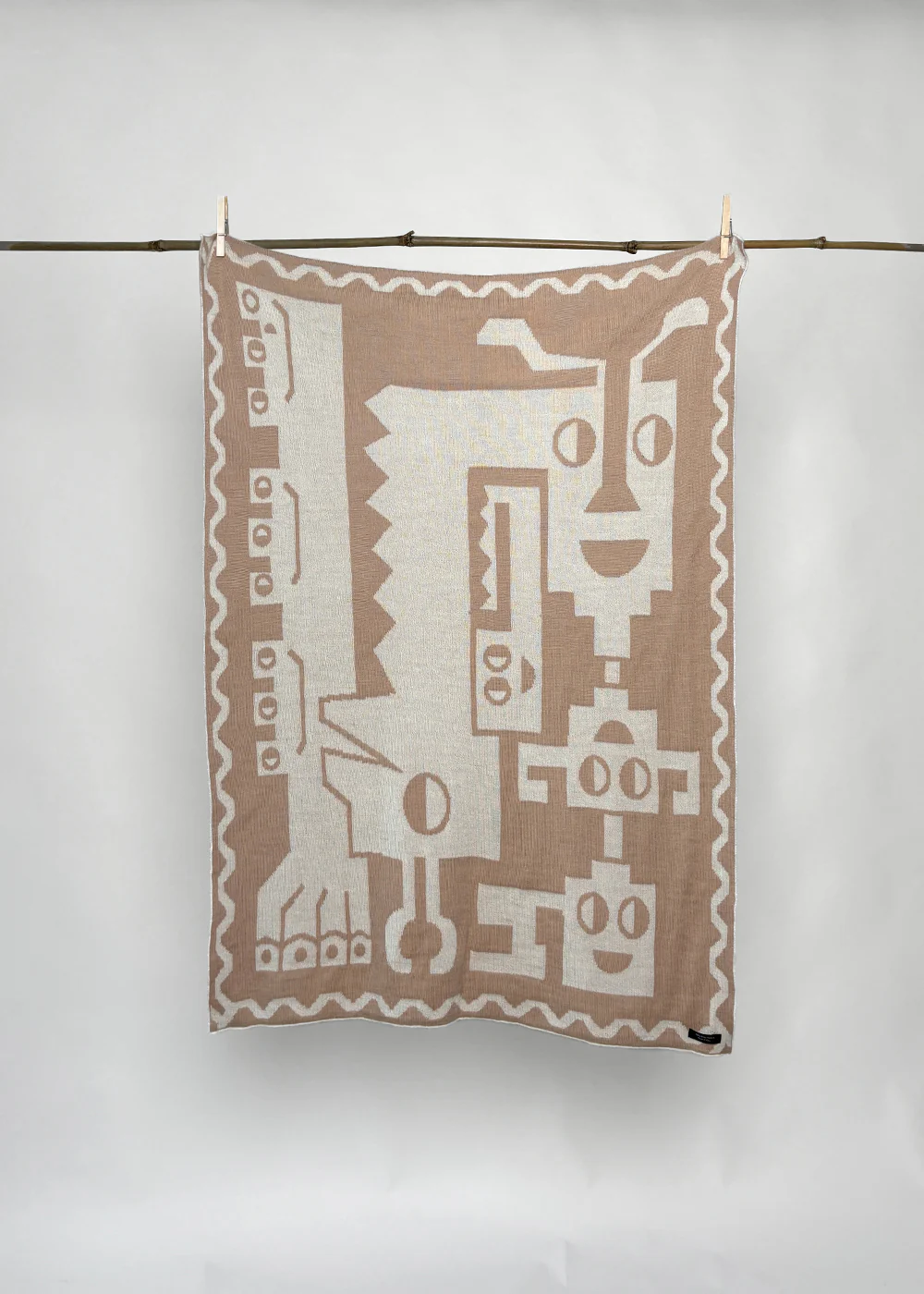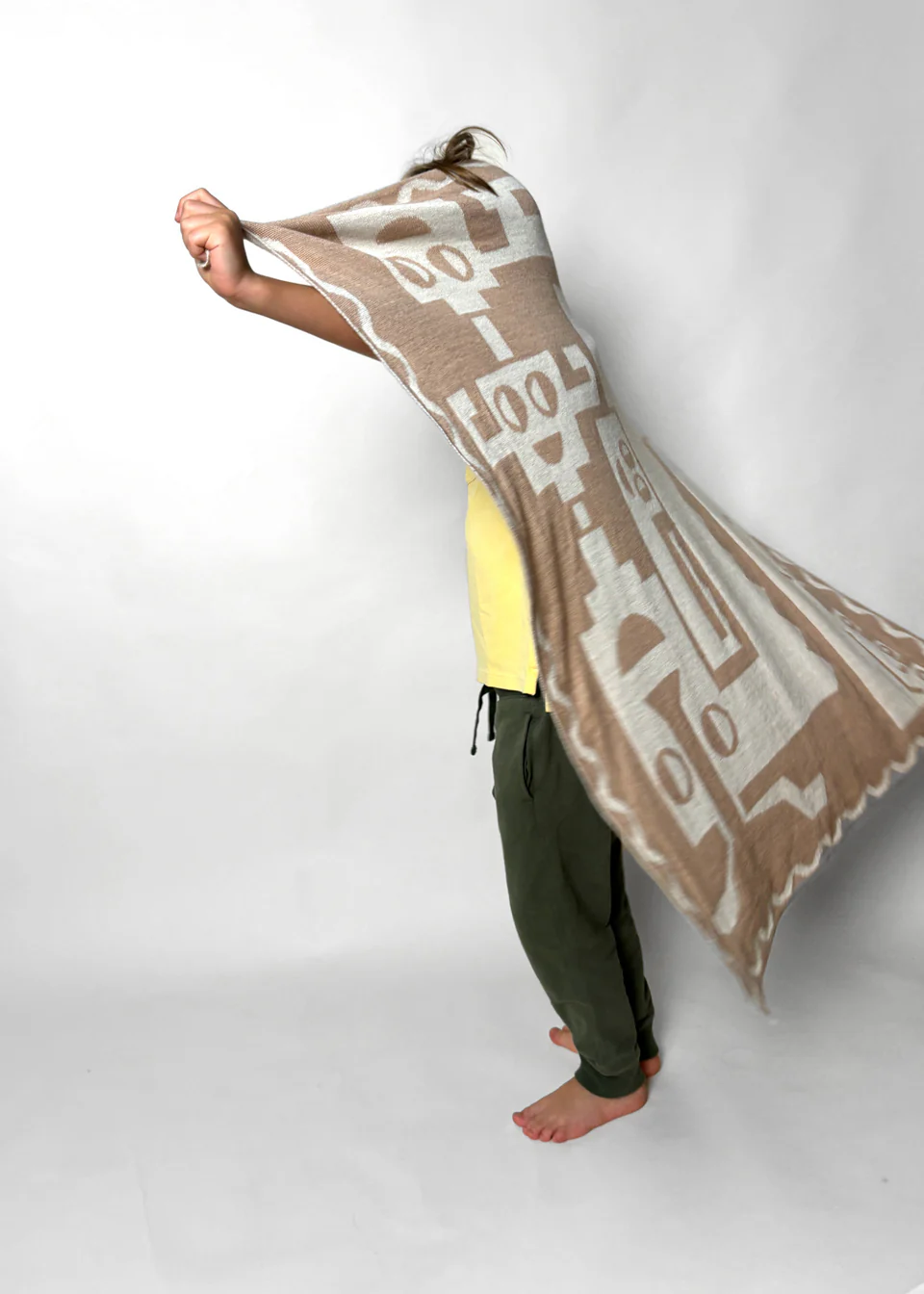 This blanket is inspired by pre-Columbian Andean imagery. The animals joined together in one shape conveys a reverence for the interconnectedness and unity of all living beings within the cosmos. It reflects the belief that humans, animals, and the natural world are all part of a single, interconnected web of existence.